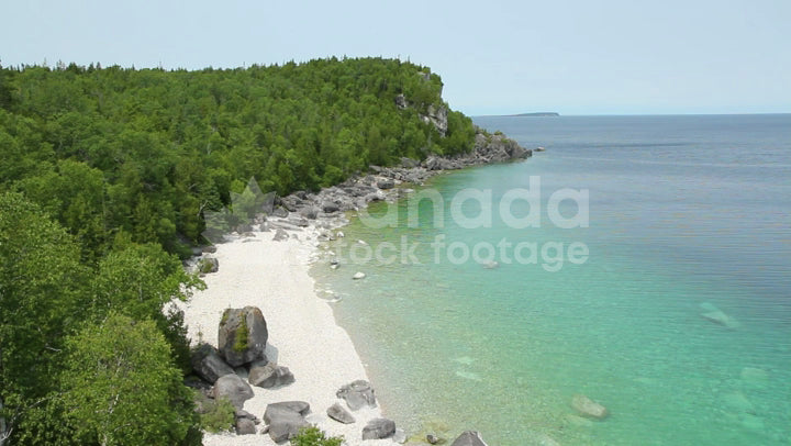 High angle view of rocky beach cove, cliff and clear, turquoise water of Georgian Bay. Bruce Peninsula National Park, Tobermory, Ontario, Canada. HD (1920 x 1080).