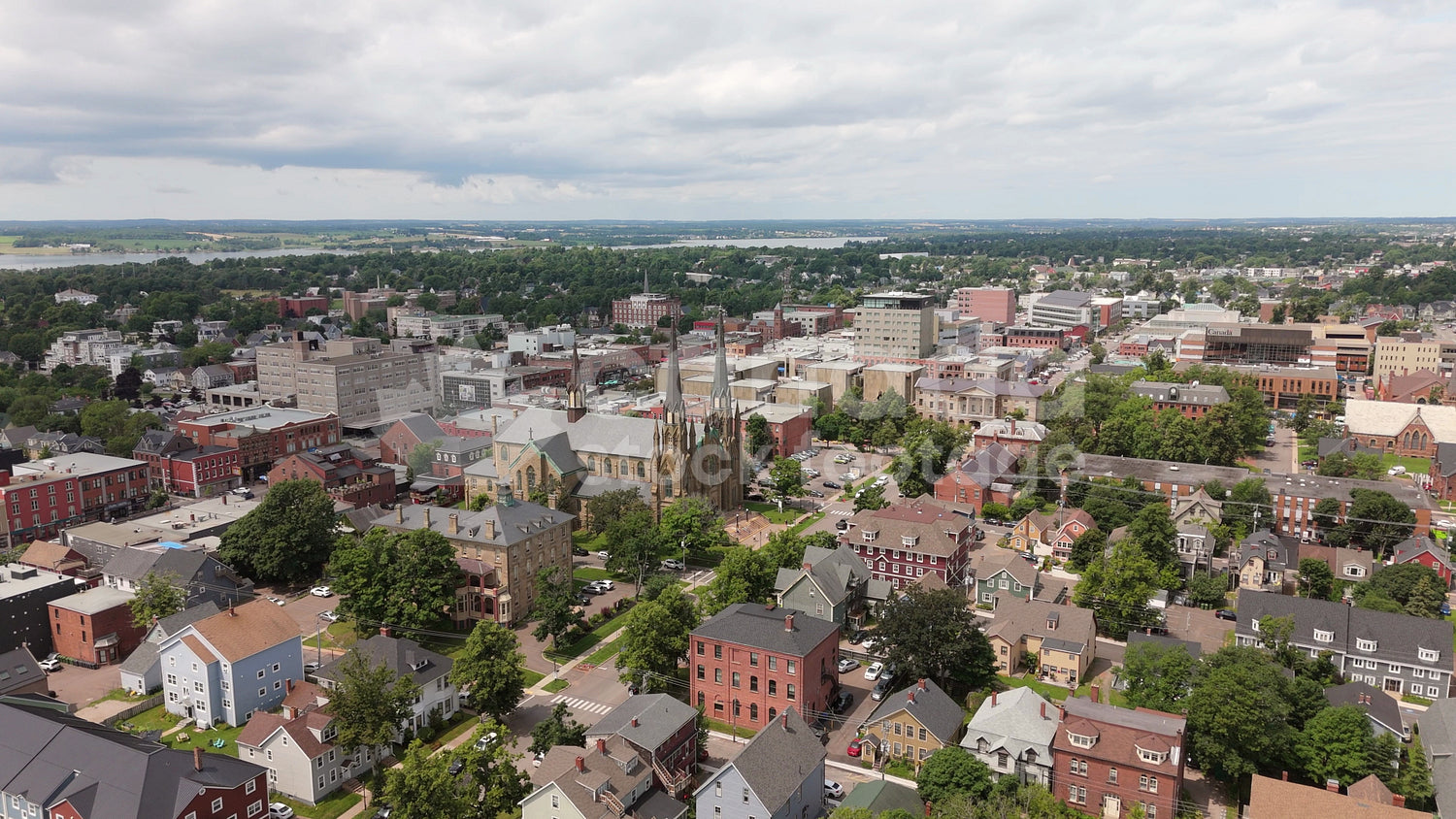 Drone aerial flight over downtown Charlottetown, PEI, Canada. St Dunstan's Basilica at center of frame. 4K. 4K (3840 x 2160) stock video.
