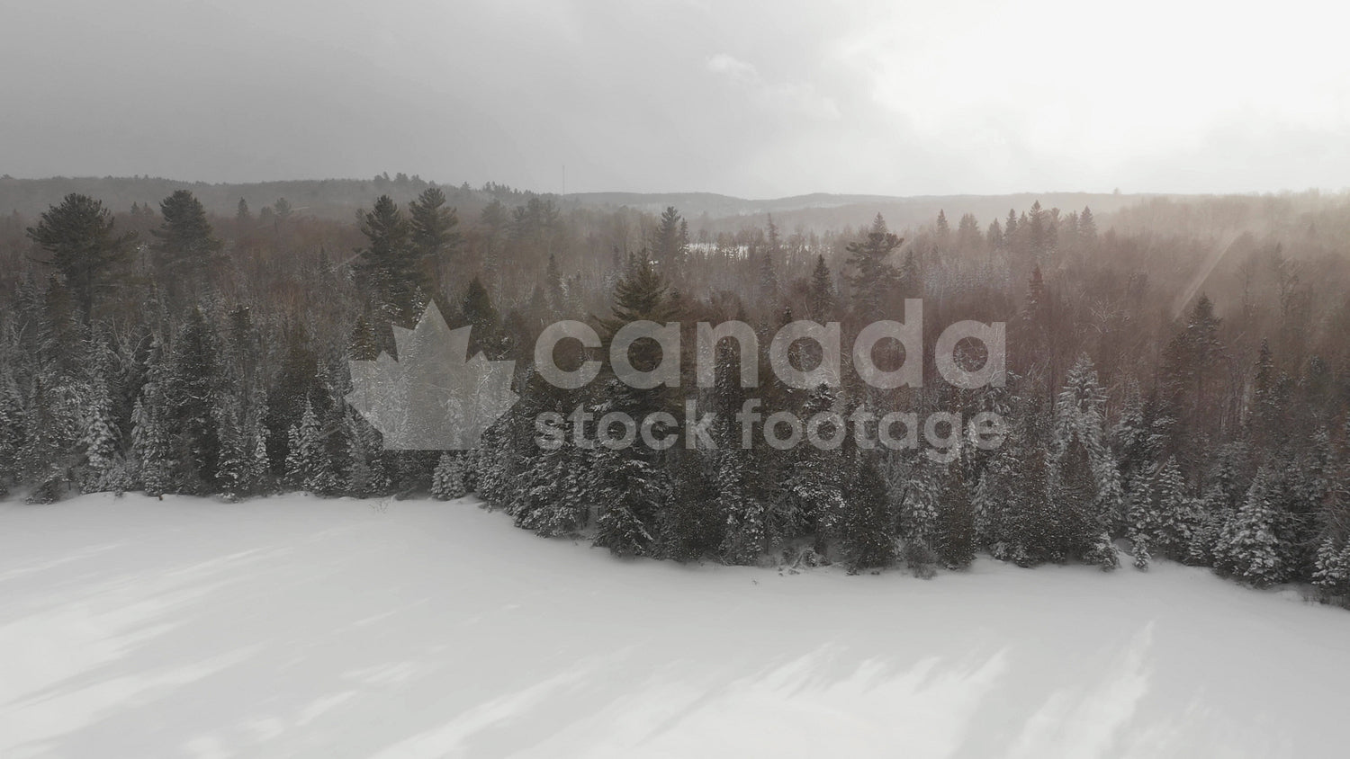 Drone flight over frozen winter lake and snow covered trees. Snow falling. Radio celltower in far distance. Ontario, Canada. 4K (3840 x 2160).