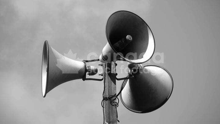 Megaphone tower with three speakers. Black and white. Clouds pass by in background. HDV footage. HD (1920 x 1080).