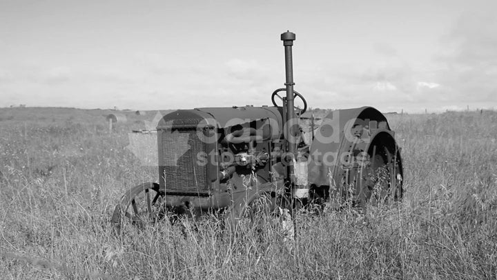 Old tractor. Saskatchewan, Canada. Black and white. HD (1920 x 1080) stock video.