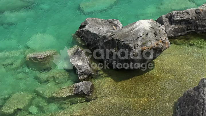 Overhead view from cliff of rocks and clear, turquoise waters of Georgian bay. Bruce Peninsula National Park, Tobermory, Ontario, Canada. HD (1920 x 1080).