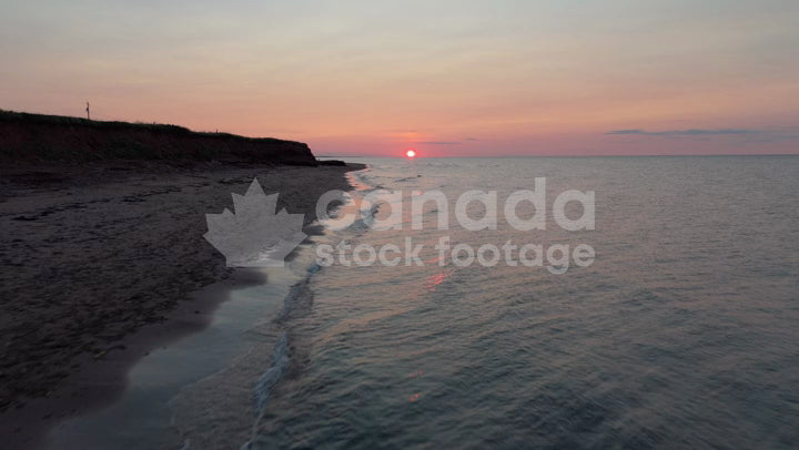 Sunset drone flight over waves by seashore. Sun on horizon. PEI, Canada. 4K (3840 x 2160) stock video.