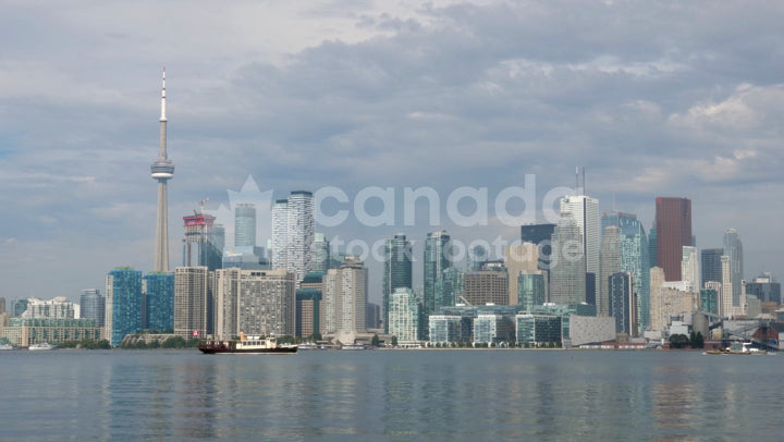 Toronto skyline on summer morning with boat. Toronto, Ontario, Canada. 4K stock video.