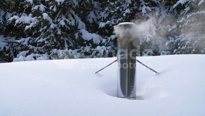 Winter chimney with wood smoke and snowy roof. Rural Ontario, Canada. 4K.
