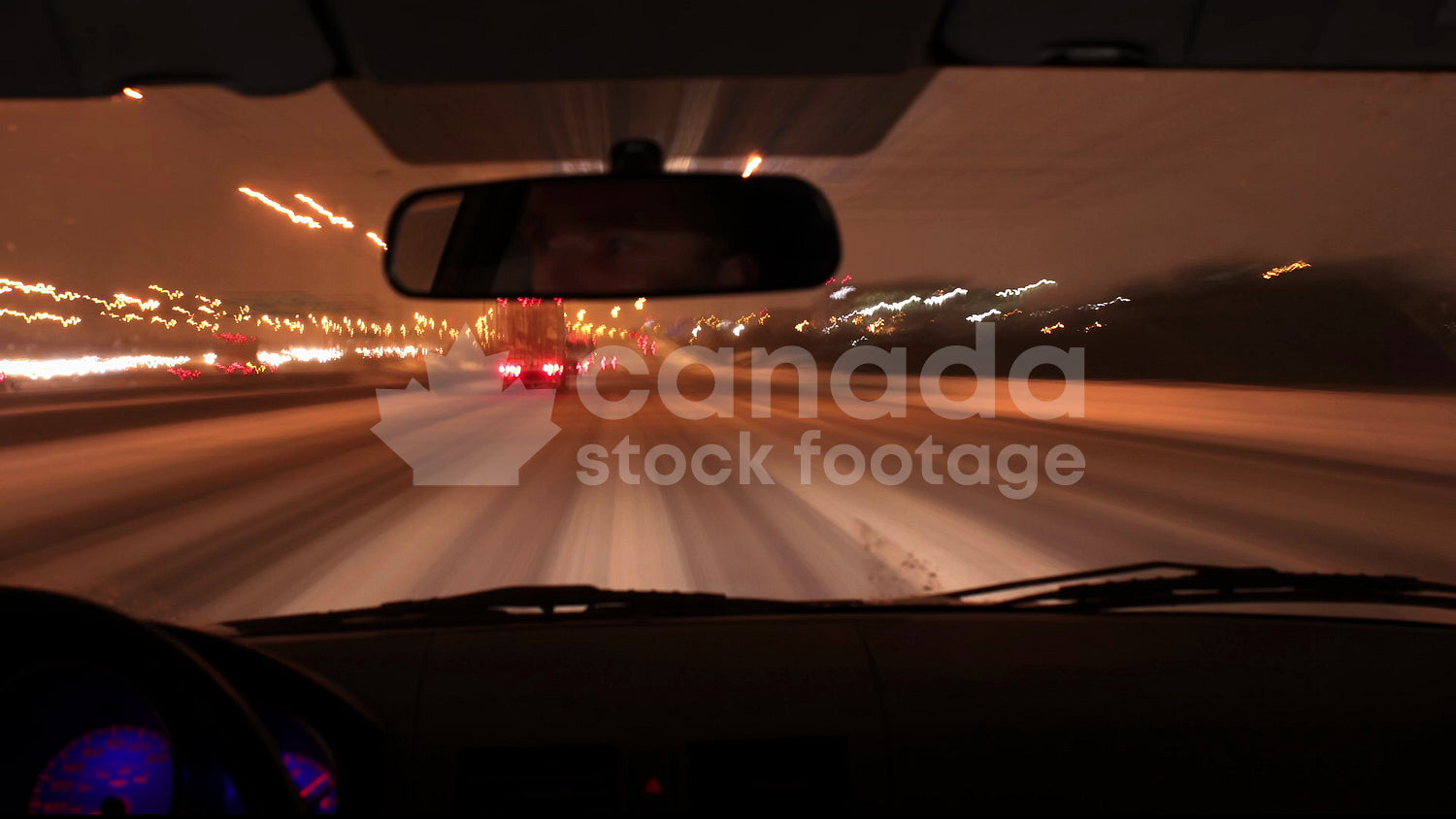 POV driving. Winter time lapse on snowy night on Toronto highway 401. No visible logos or license plates. HD (1920 x 1080) video.